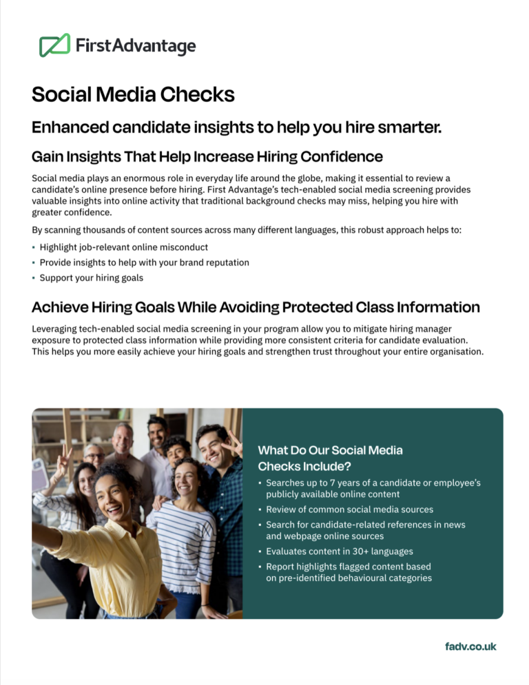 Social Media Search from First Advantage helps you identify the actions and behaviours of a candidate or employee who may present a potential risk to your company or create an unsafe and unwelcoming workplace. Likewise, it can also find positive attributes of candidates who may be a good fit in the culture of your company.